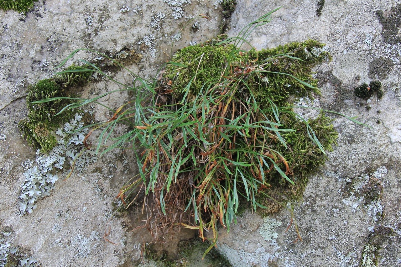 На территории памятника природы «Рачейские скалы» продолжено ежегодное наблюдение за популяцией редчайшего папоротника Самарской области – костенца северного (Asplenium septentrionale). Осмотрено наличие ещё 3-х новых куртинок (один папоротник найден А.Е. Кузовенко осенью 2024 г., два - обнаружены Ю.М. Трофимовым весной 2025 г.) А вот самый молодой экземпляр костенца, впервые найденный нами в 2024 г., к сожалению, оказался погибшим. Теперь на сегодня достоверно известно о существовании не менее 14-и живых куртин.