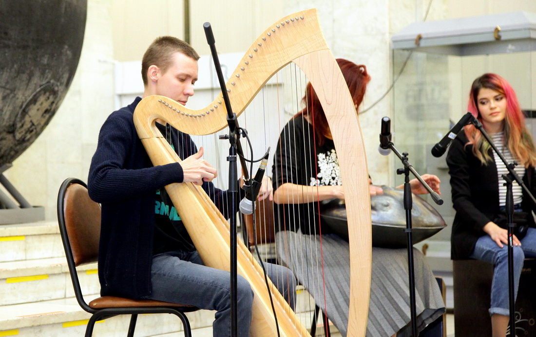 Торжественное открытие «Ночи искусств» состоится в 19:00. Команда «Татьяна Елецкая Project» познакомила зрителей с необычными музыкальными инструментами – кельтской арфой, хангом и кахоном. Другие не менее необычные музыкальные инструменты можно было увидеть на выставке из фондов музея, которая работает в зале «Восток».