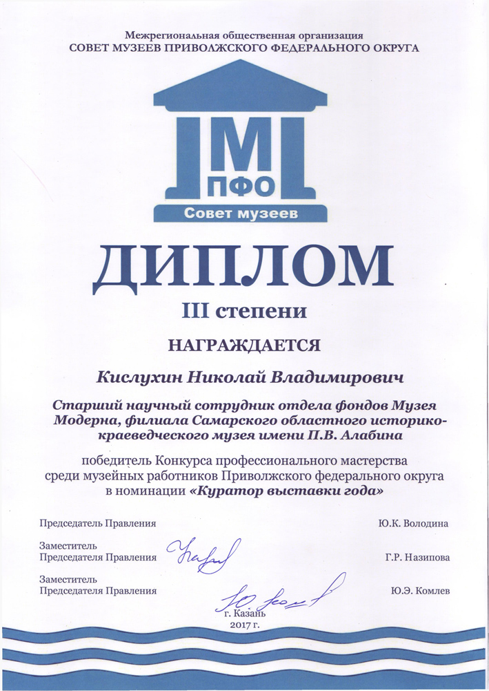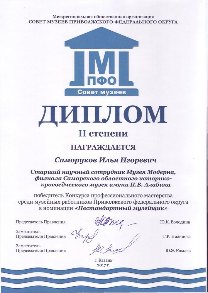 В октябре 2017 г. в г.Казани состоялось подведение итогов Конкурса профессионального мастерства музейных работников в Самарской области. На заседании жюри, состоящего из членов Правления Межрегиональной общественной организации «Совет музеев Приволжского федерального округа», были отобраны призовые работы и определены победителями.