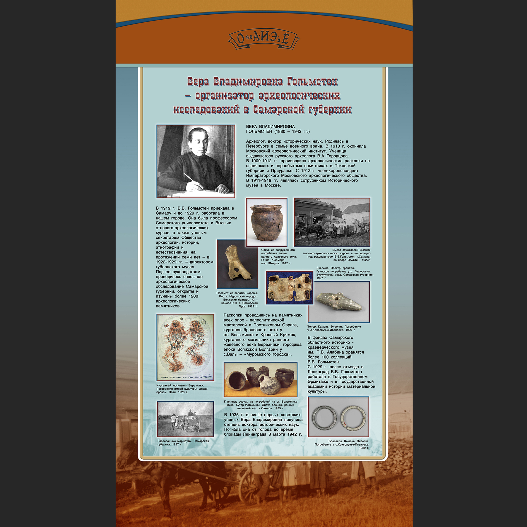 20 июня 2023 г. в МБУК Историко-краеведческий музей «Самарская Лука» (г. Жигулевск) начала работу археологическая выставка «Археолог В.В. Гольмстен – исследователь Самарской Луки». Эта выставка – дань памяти выдающемуся ученому, археологу, активному члену Самарского общества археологии, истории, этнографии и естествознания, самоотверженному исследователю, стоявшему столетие назад у истоков самарской археологии – профессору Самарского университета В.В. Гольмстен (1880-1942). Силами и стараниями Веры Владимировны и ее единомышленников были проведены первые масштабные археологические исследования на территории Самарской губернии, в т.ч. на Самарской Луке.