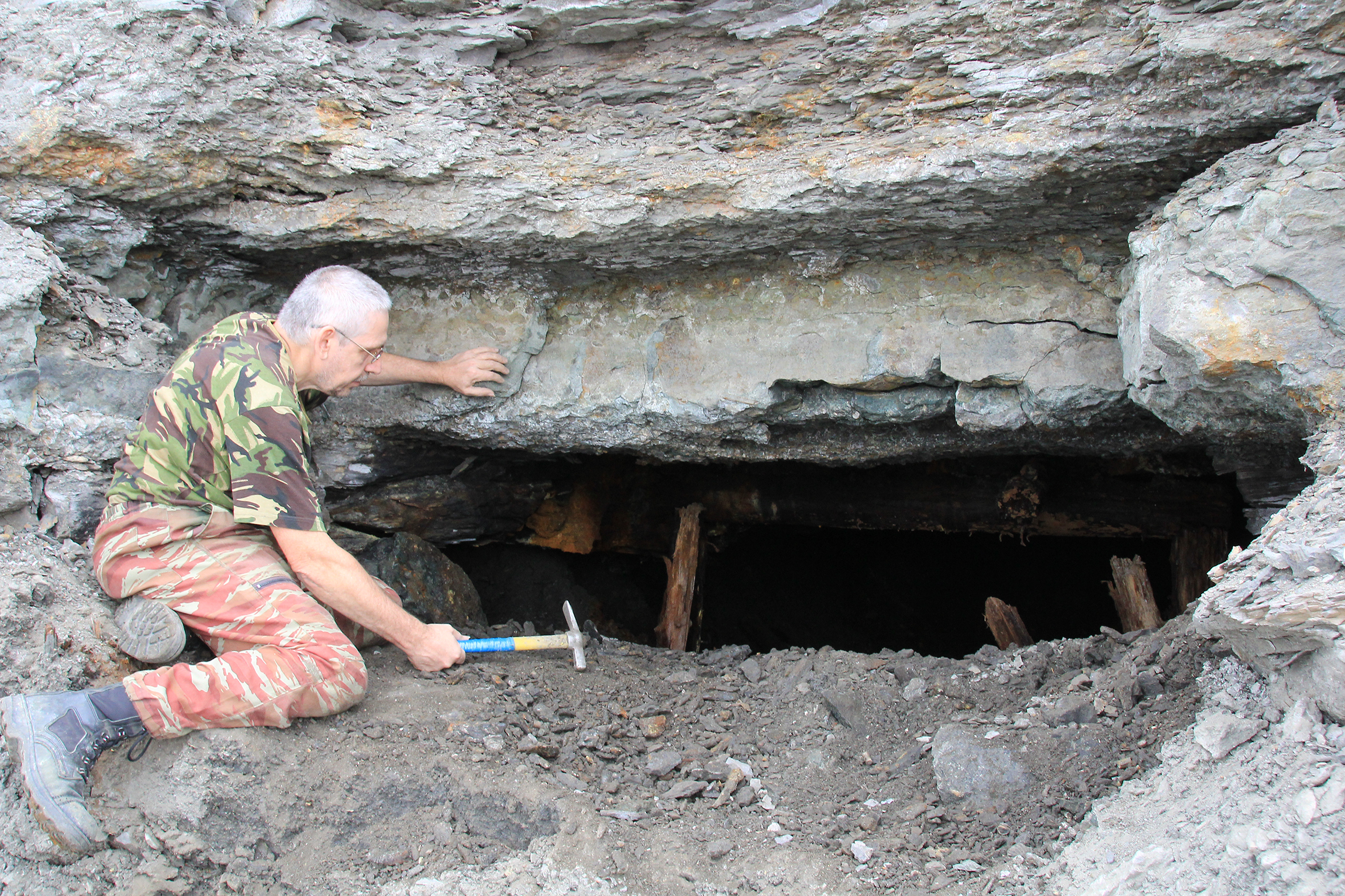 В ходе обследования берега Волги была сделана неожиданная находка – в обрыве обнаружена крупная щель, ведущая в подземную полость, вскрывшаяся в результате обвала берега. Была проведена частичная расчистка щели для визуального обследования. Стало понятно, что это небольшой участок одной из штолен по добыче горючего сланца начала ХХ в., глубина не более 10 м с остатками бревенчатых крепей, его дальняя часть завалена. Объект был сфотографирован, но дальнейшее обследование не производилось в связи с вероятностью обвала.